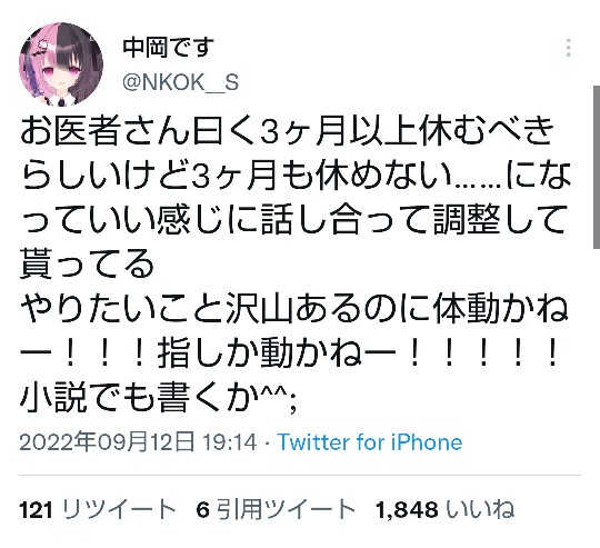 中の人はこの仕事辞めたら、普通に稼げないだろうけど、数か月療養ならいいんじゃないかなぁ。