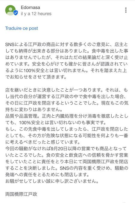 そして、この先食中毒を出してしまったら生食文化にも影響を及ばす可能性があり、真面目に飲食店を営まれている方たちに迷惑をかける可能性があるので江戸政を閉店しました。