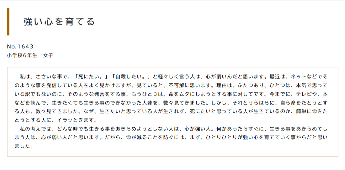 だから、命が減ることを防ぐには、まず、ひとりひとりが強い心を育てていく事からだと思いました