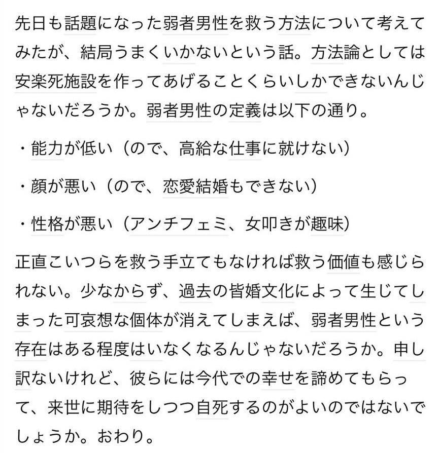 弱者男性に限らず、「不幸だけどそこから抜け出す努力もせず、周りを下げることで相対的に自分を上げようとしか考えられない奴」ってのは居るし、言い方悪いがそういうのは居なくなってくれた方が『社会全体の幸福度』的なものは上がるってのは否定できんよ。