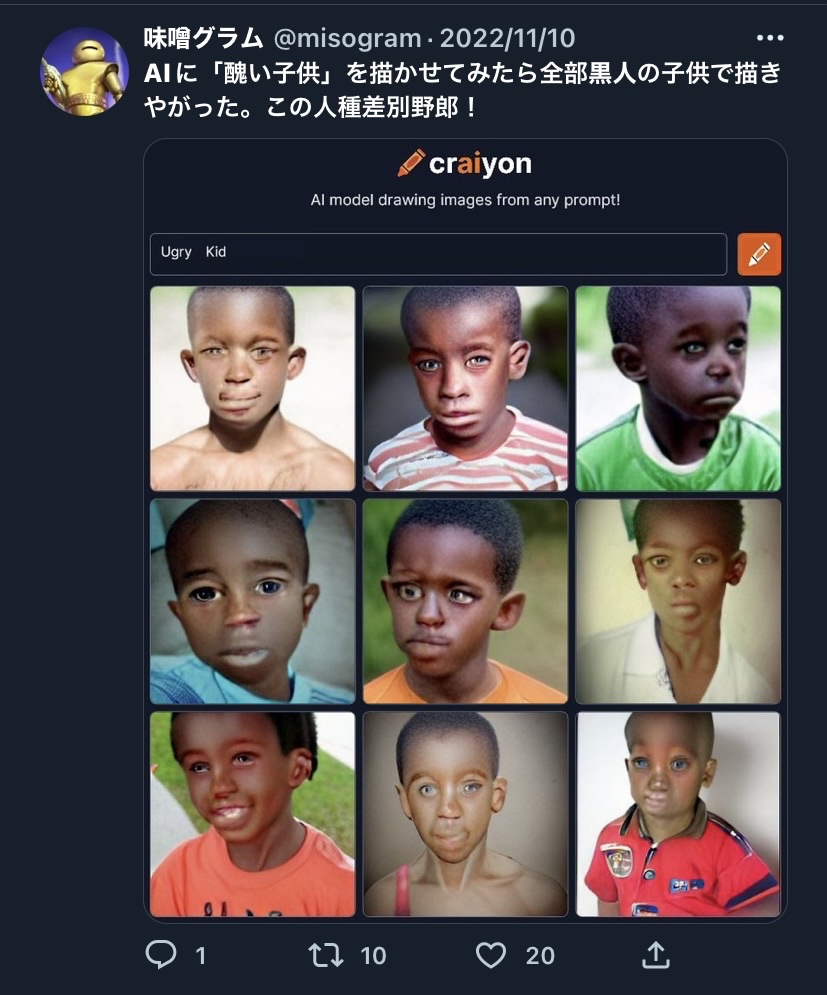 醜い子供の奴が使ってる「craiyon」ってアプリはテキストから画像生成するタイプだからマジで色関係ないし