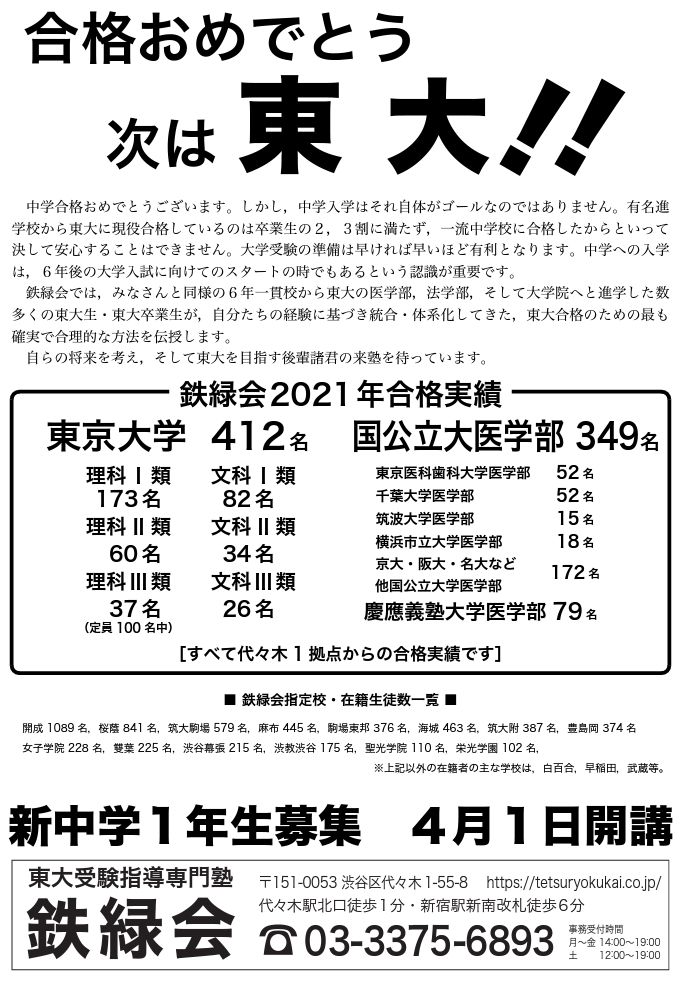 なお、鉄緑会の指導がすごいから受かるというより、受かる生徒が在籍しているというのが実態