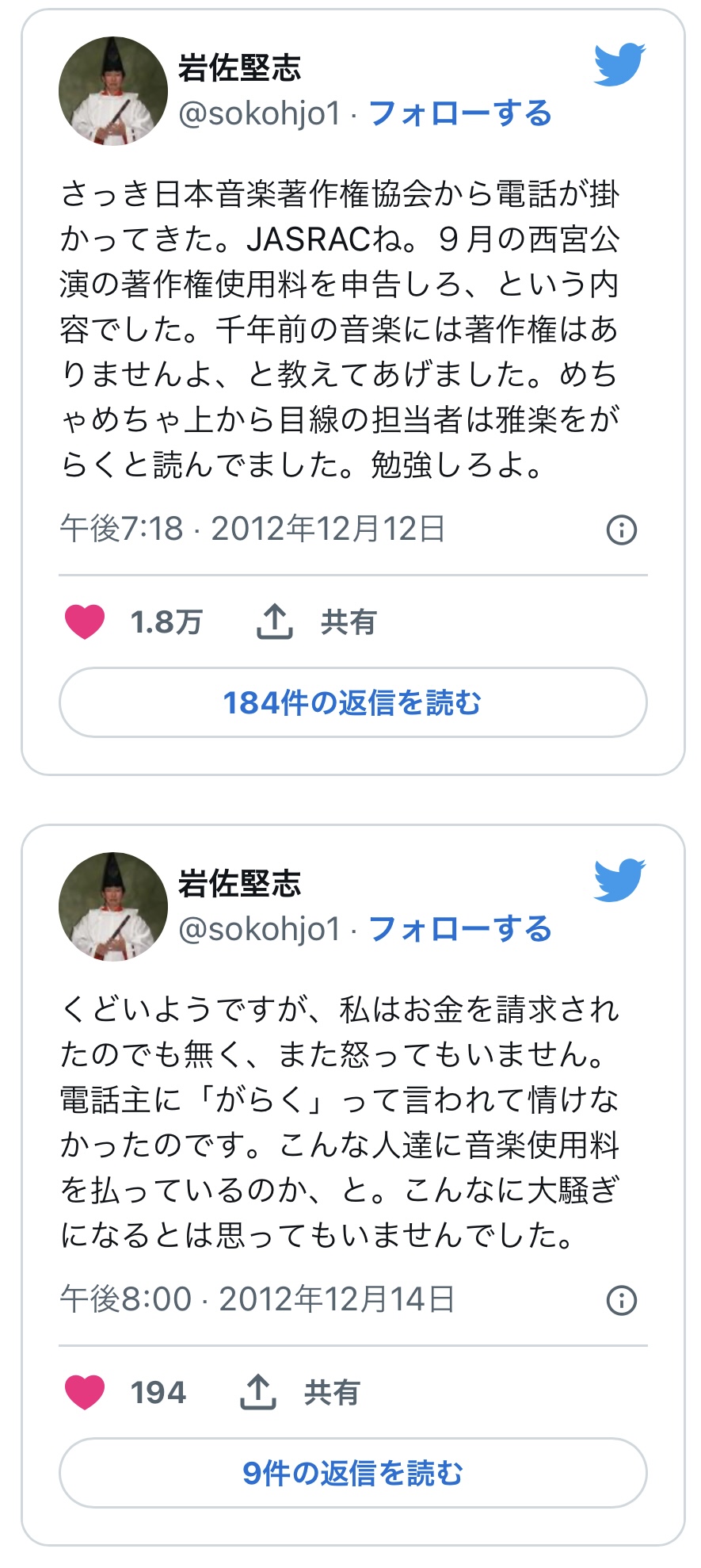 雅楽の件は名前を使った詐欺かとも思ったけどほんまもん臭い
