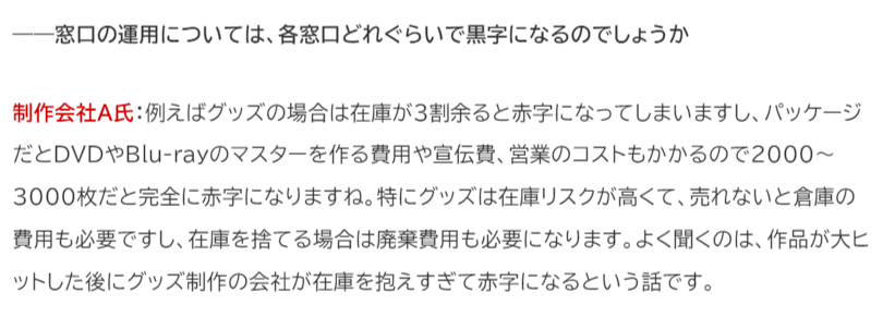 制作会社A氏:例えばグッズの場合は在庫が3割余ると赤字になってしまいますし、
