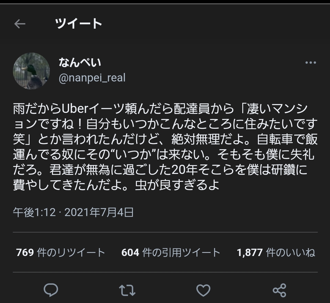 てか雨だからウーバーって発想がよく分からん、自炊出来ませんっていう自己紹介?外食だと雨に濡れるから?タワマン住んでるくらいだったら雨に一切濡れずに外食くらい出来るでしょ