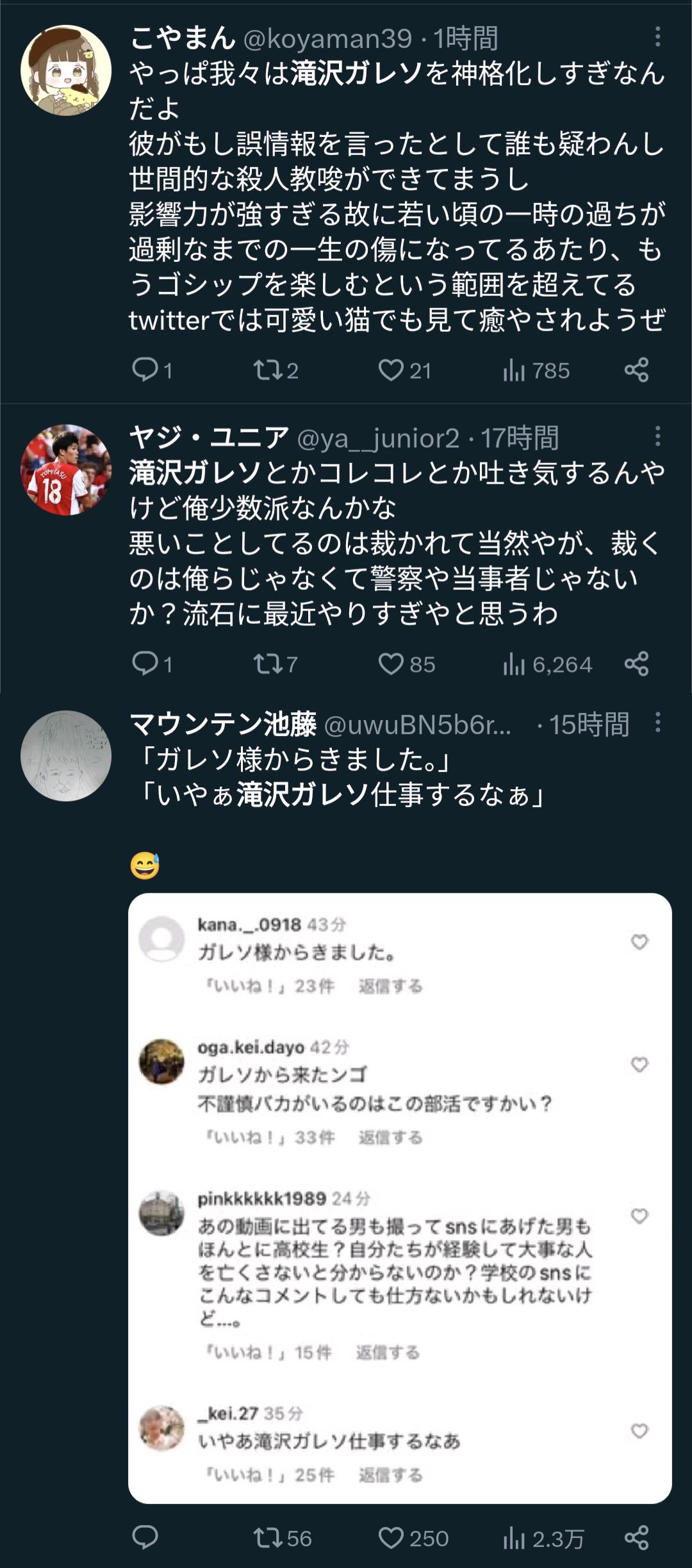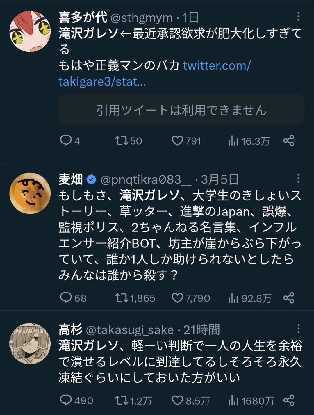 【話題】「滝沢ガレソはアカ凍結されるべき」「軽い判断で人の人生を潰せるレベルに到達しており危険」というツイートがバズり中