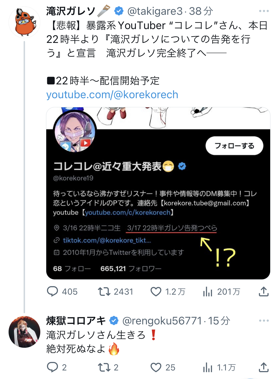 【悲報】暴露系YouTuber “コレコレ”さん、本日22時半より『滝沢ガレソについての告発を行う』と宣言 滝沢ガレソ完全終了へ──