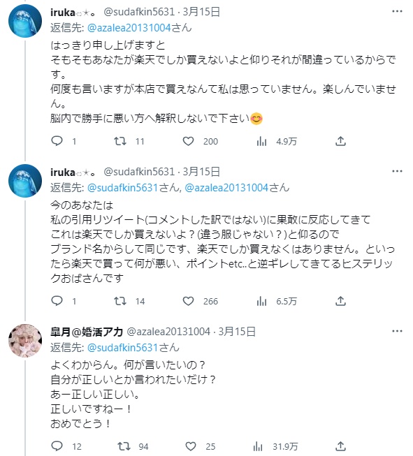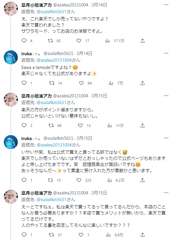 楽天でしか買えねーけど?って言うのはアンタが着てたの違う服じゃないの?って事じゃないのか?その後のやりとりは謎でしかないが