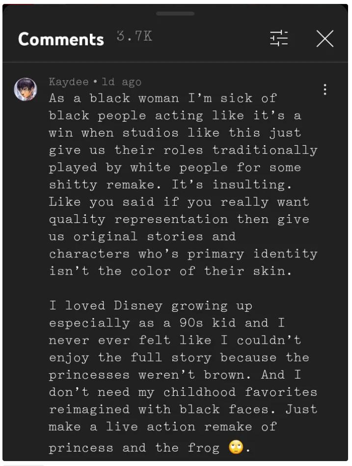 では、黒人版リトルマーメイドが大嫌いだと主張する黒人女性のコメントをお読みください