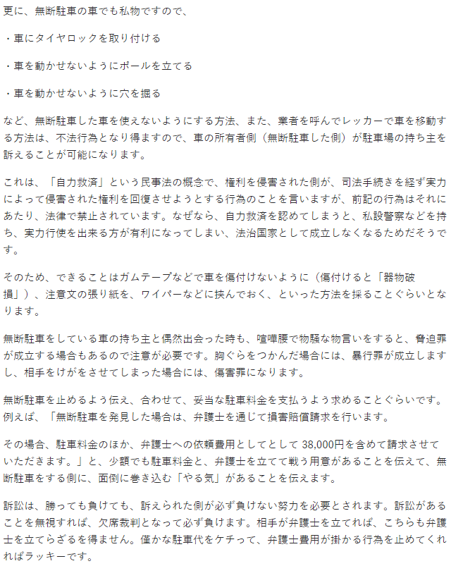 ついでに言うと違法駐車にタイヤロック付けるのも違法だからそもそも違法駐車出来へんような対策せにゃ泣き寝入りやねんな