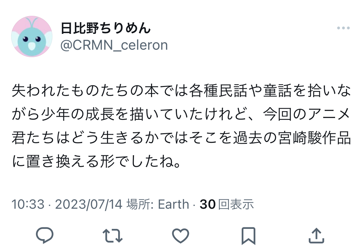 「君たちはどう生きるか」鑑賞終了。面白かった。戦時下の話だけど特に説教くさく無いいつものジブリだった。あとどう生きるかマンは菅田将暉だったし主題歌は米津玄師だった