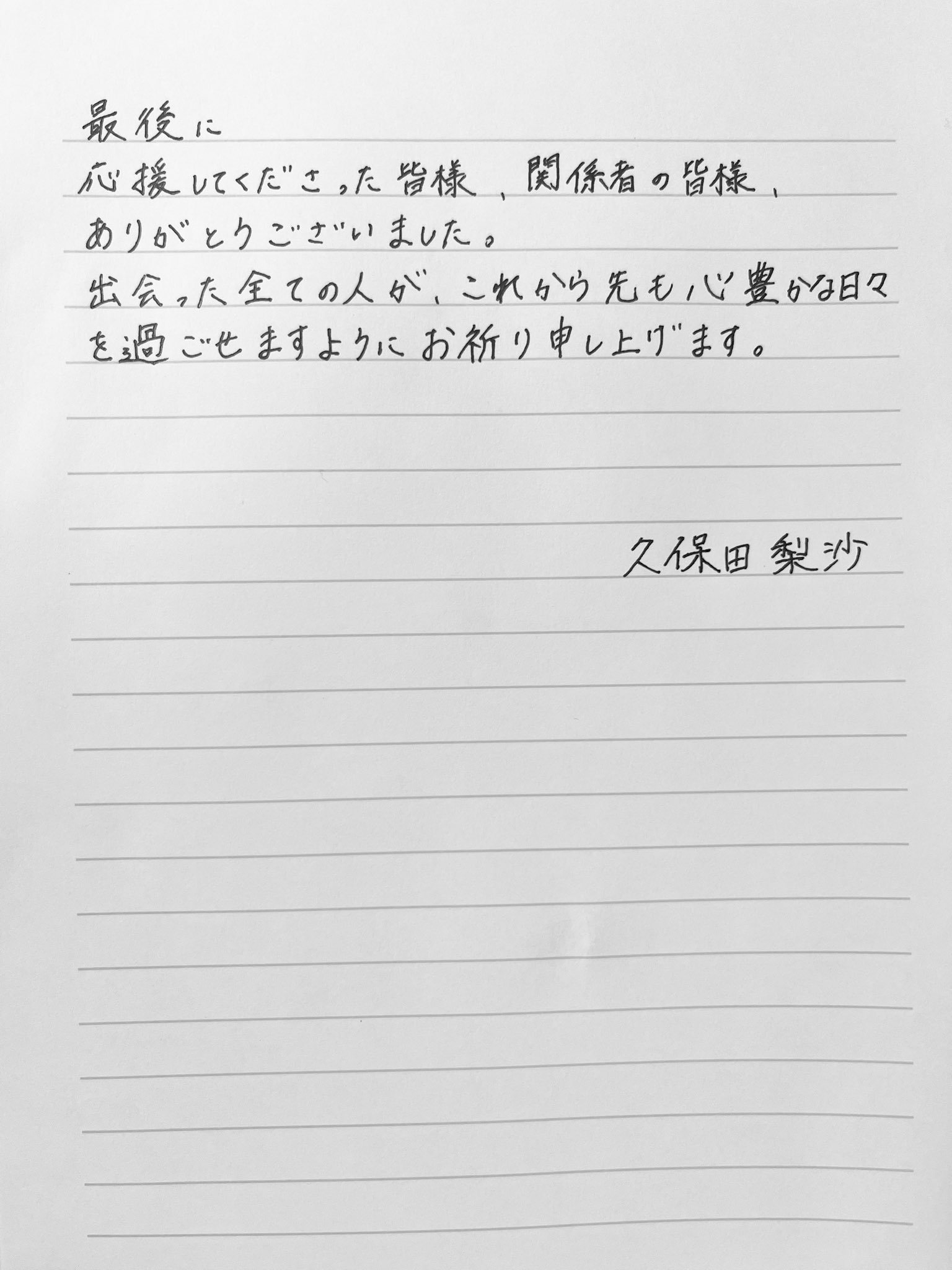応援してくださった皆様、関係者の皆様、ありがとうございました。出会った全ての人が、これから先も心豊かな日々を過ごせますようにお祈り申し上げます」としたためた。