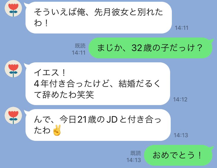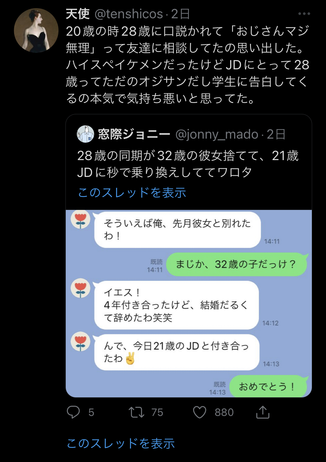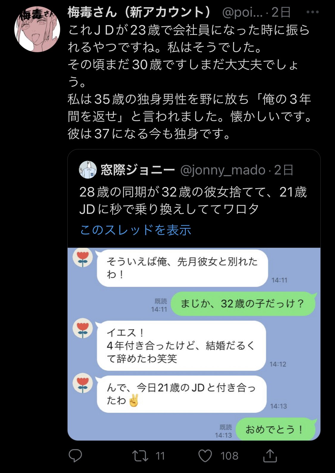 28歳の同期が32歳の彼女捨てて、21歳JDに秒で乗り換えしててワロタ https://t.co/Wu4ckZ785l