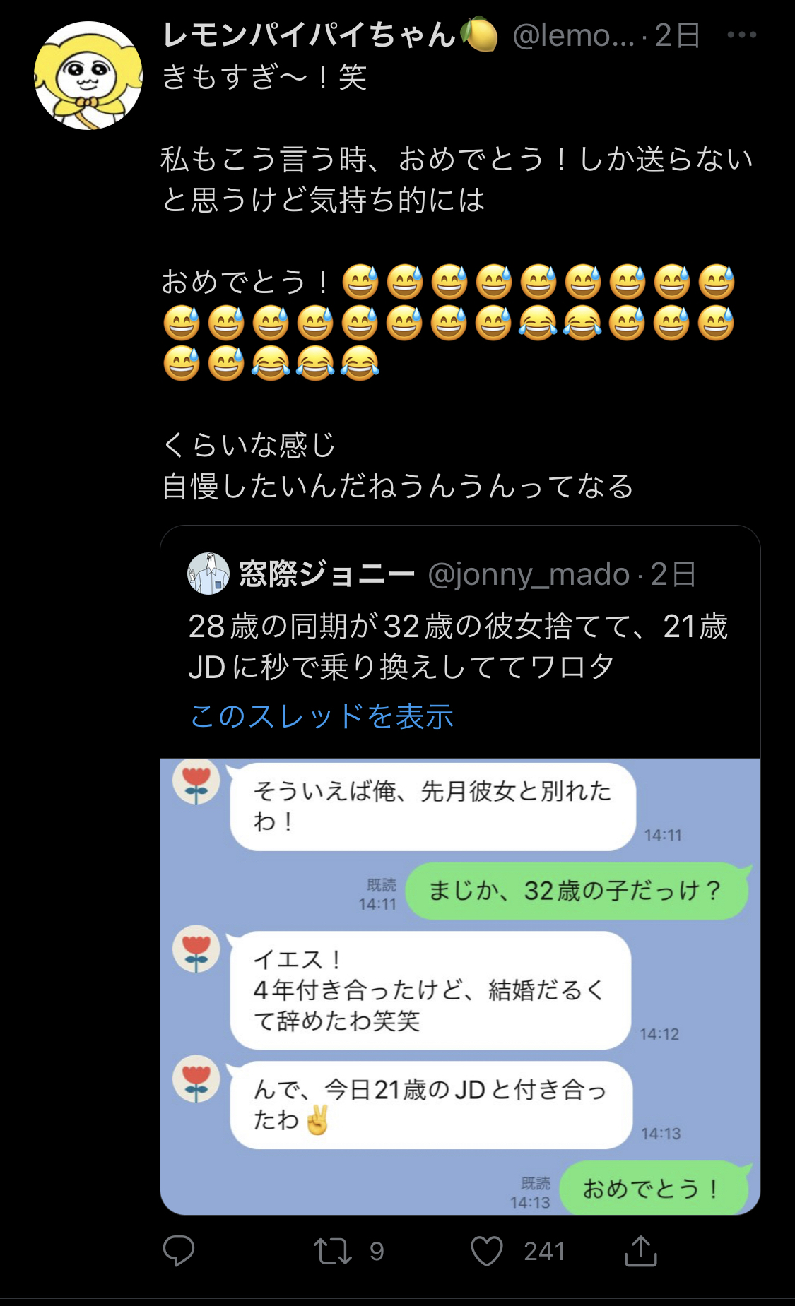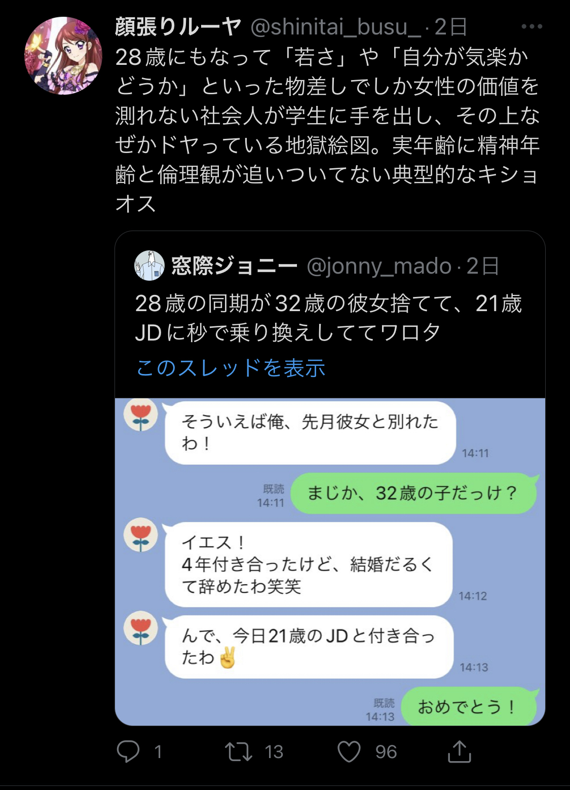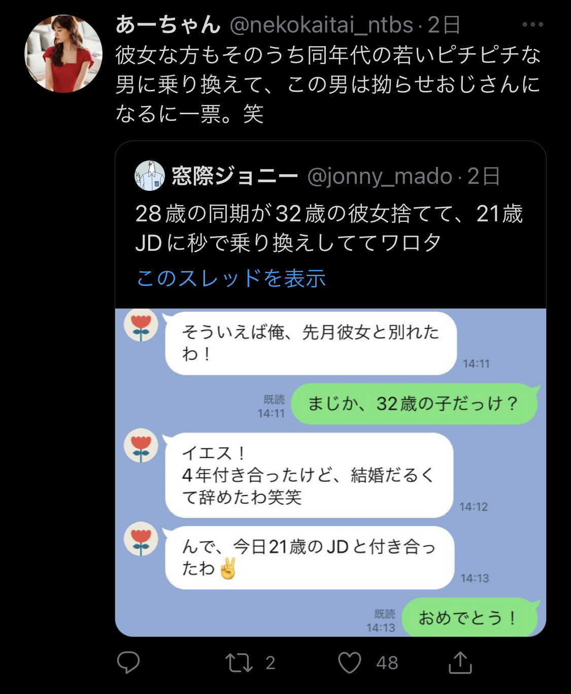 28歳の同期が32歳の彼女捨てて、21歳JDに秒で乗り換えしててワロタ https://t.co/Wu4ckZ785l