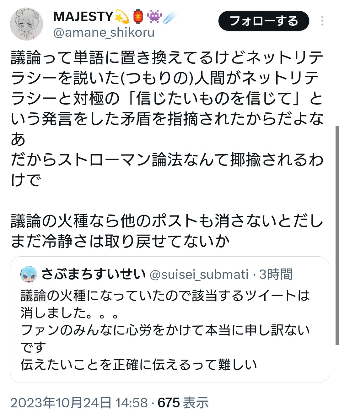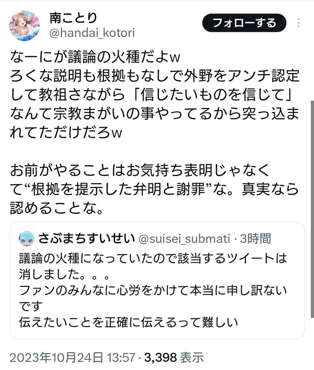 裏で好きなだけ繋がってようが友達ですでゴリおせばいいだけなのに、散々匂わせしてきたものを掘られたらネットリテラシーだの持ち出して自分は悪くないとかそりゃ受け入れられないでしょ。