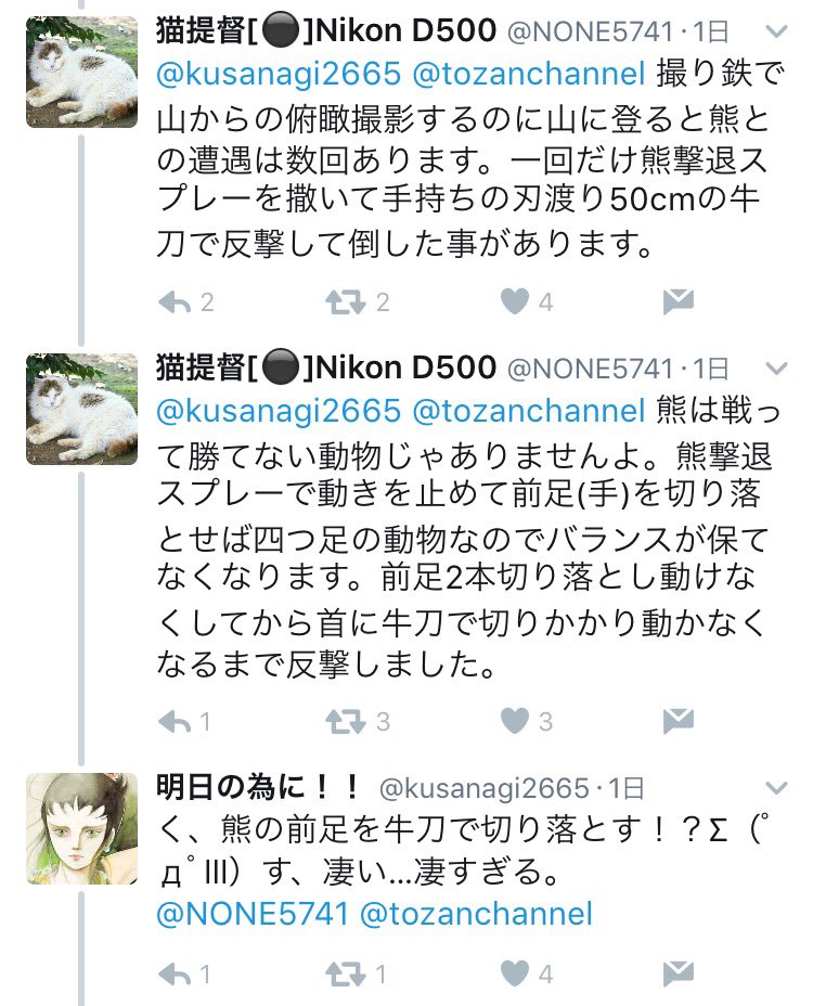 撮り鉄で山からの俯瞰撮影するのに山に登ると熊との遭遇は数回あります。一回だけ熊撃退スプレーを撒いて手持ちの刃渡り50cmの牛刀で反撃して倒した事ことがあります。