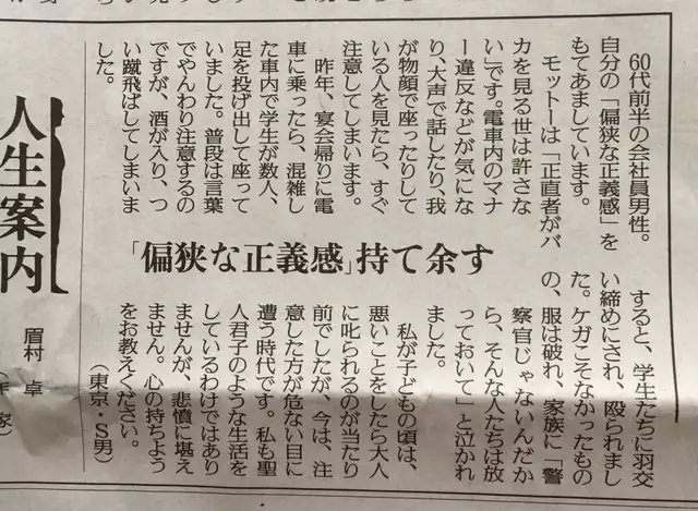 この新聞の爺さんも同じように感じる。歳をとったから年配者としての有難い言葉を!って精神はいい迷惑にしかならない部分が有る。お爺さんだって自分がマナーの悪いことをしていたのを若い子に変な注意をされたらイラっとくるだろうし、相手の視点に立つ精神を持つことのほうが心の持ちようとしては大事なのでは?と思うね