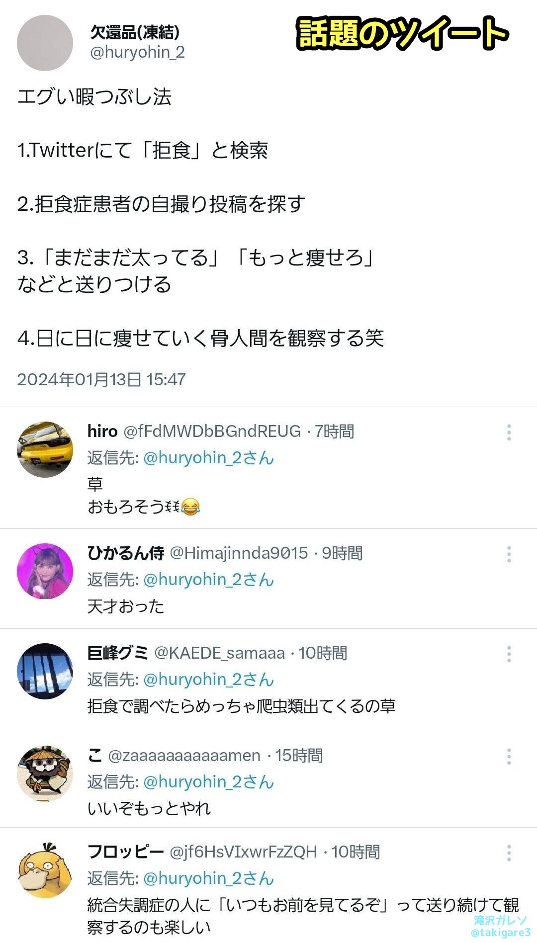 【鬼畜】ツイート検索から拒食症の女性を探し、あえて「太りすぎ」「もっと痩せろ」等とリプを送りつけて精神的に追い込む悪魔のような暇つぶしが発案される