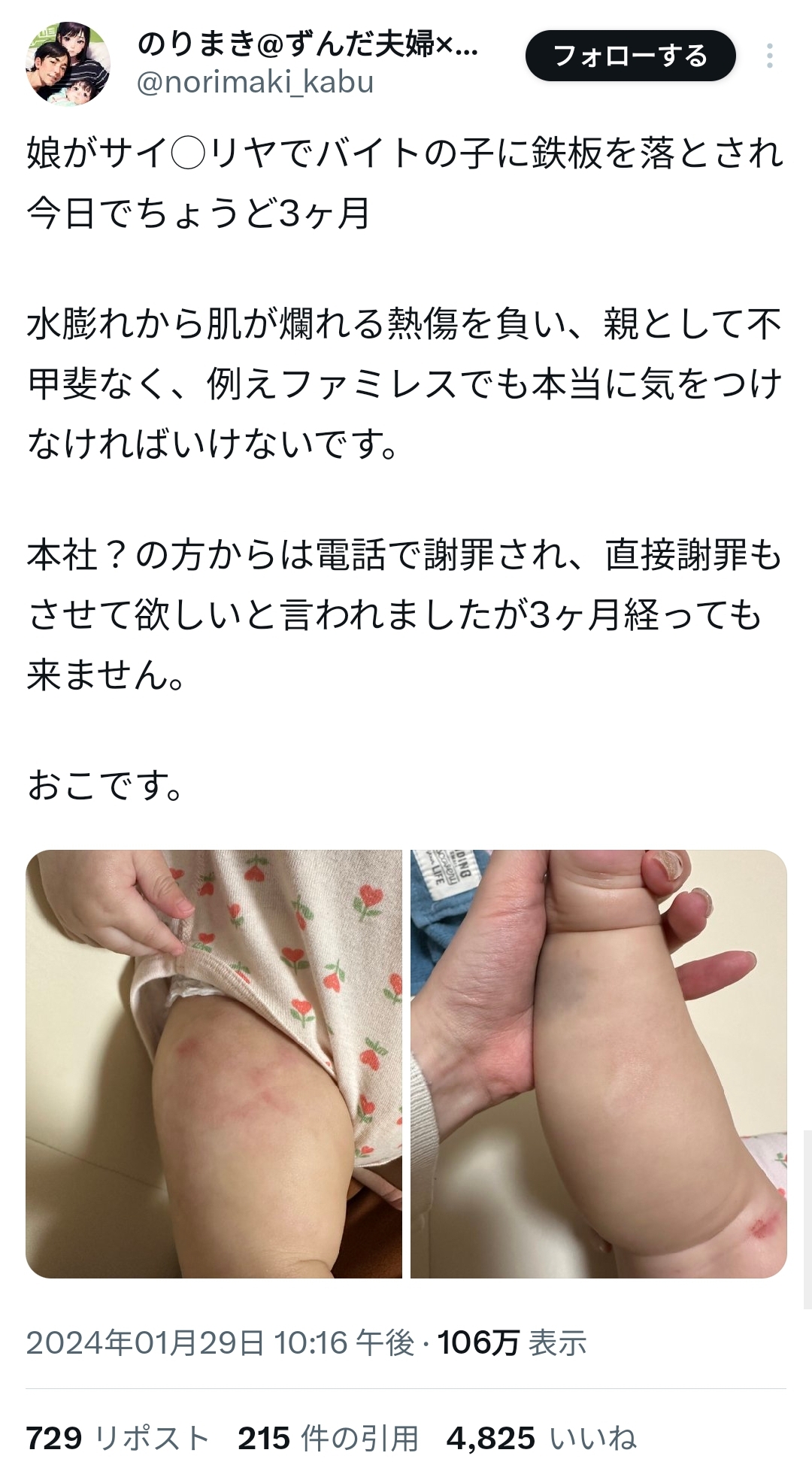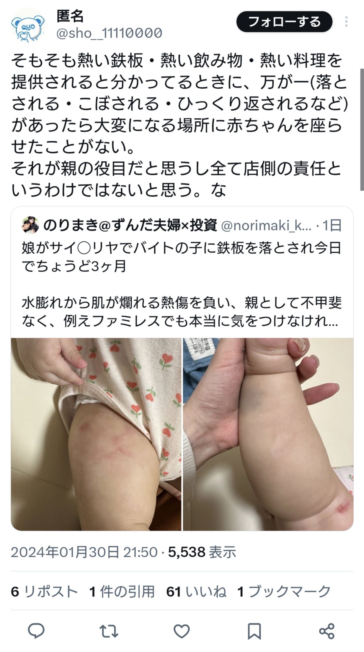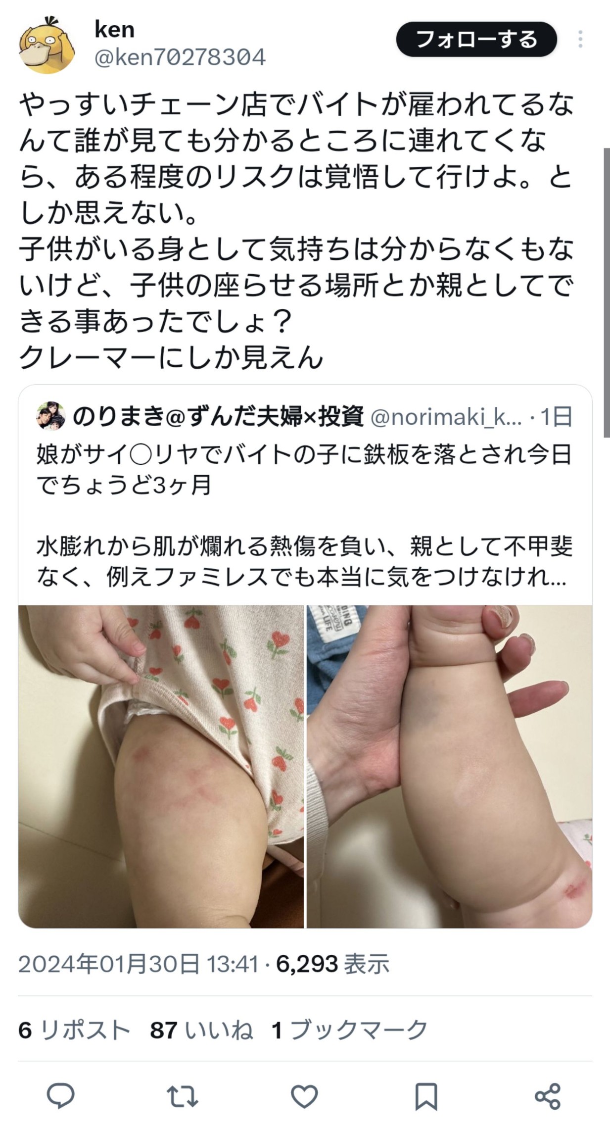 今回の件もそのくらい覚悟して行けだの、相手はバイトだから仕方ないだの、座らせる場所を工夫しない親の責任だのと店側を擁護して客を叩くコメントばかり