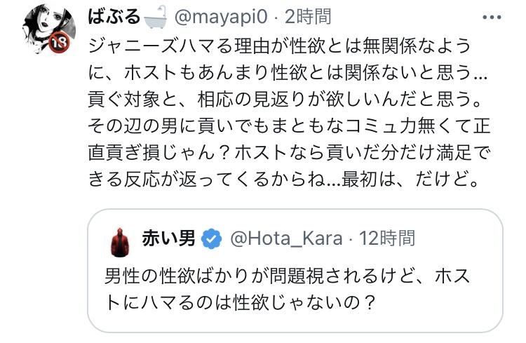 「ホストに大金を貢げるアタシ凄いでしょ!」「このホストはアタシがNo.1にした」的な感情もあるんだと思う。承認欲求もあるんじゃねえかな