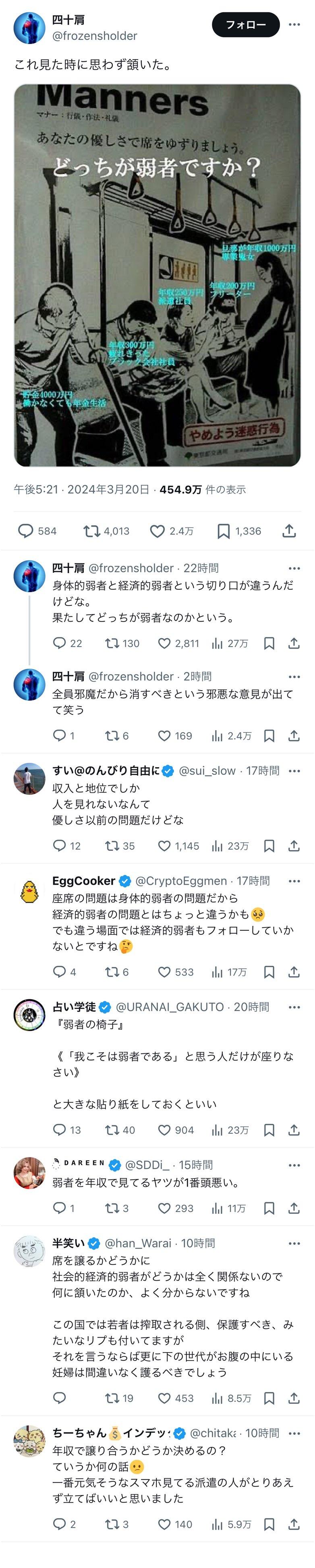 収入は低くても健康な人間が「あの妊婦は金持ちだから席譲らない」とはならんやろ