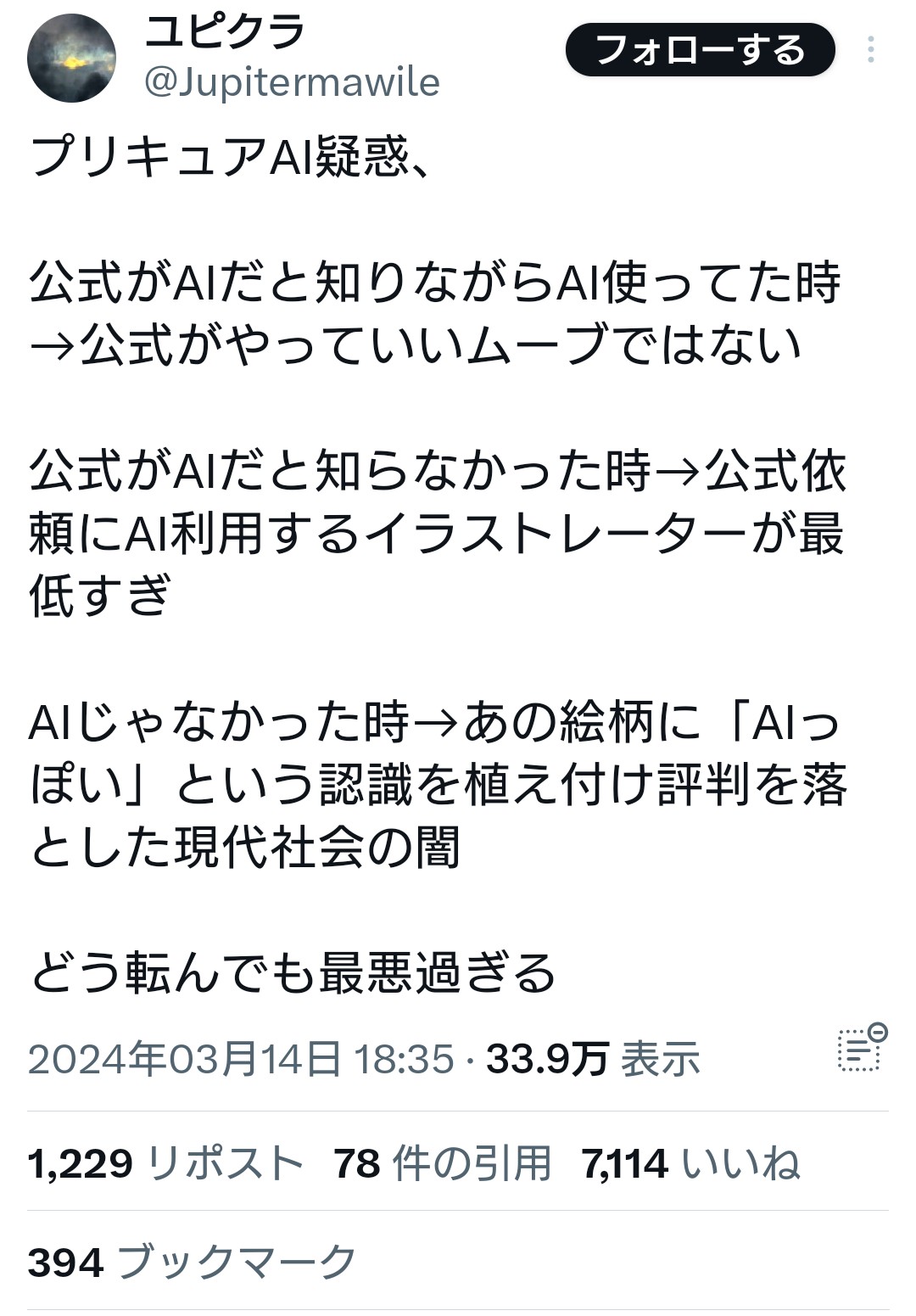 で済む話なのに、なんでキモオタがファンでいるための謂れのないAI疑惑を晴らすのを公式がやらねばならんのだ。