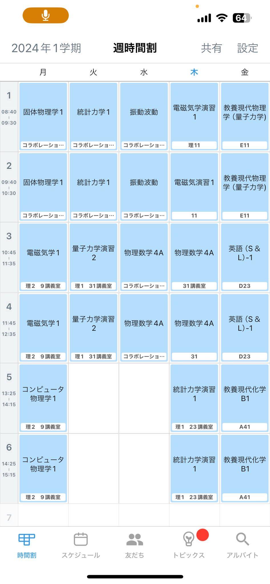 うちの大学は日によってはもう1つ後の時間もあったからそれに比べたら楽よ
