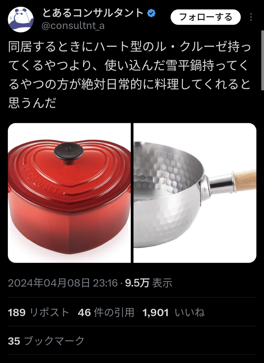 同居するときにハート型のル・クルーゼ持ってくるやつより、使い込んだ雪平鍋持ってくるやつの方が絶対日常的に料理してくれると思うんだ pic.twitter.com/mKQ0an4gQT