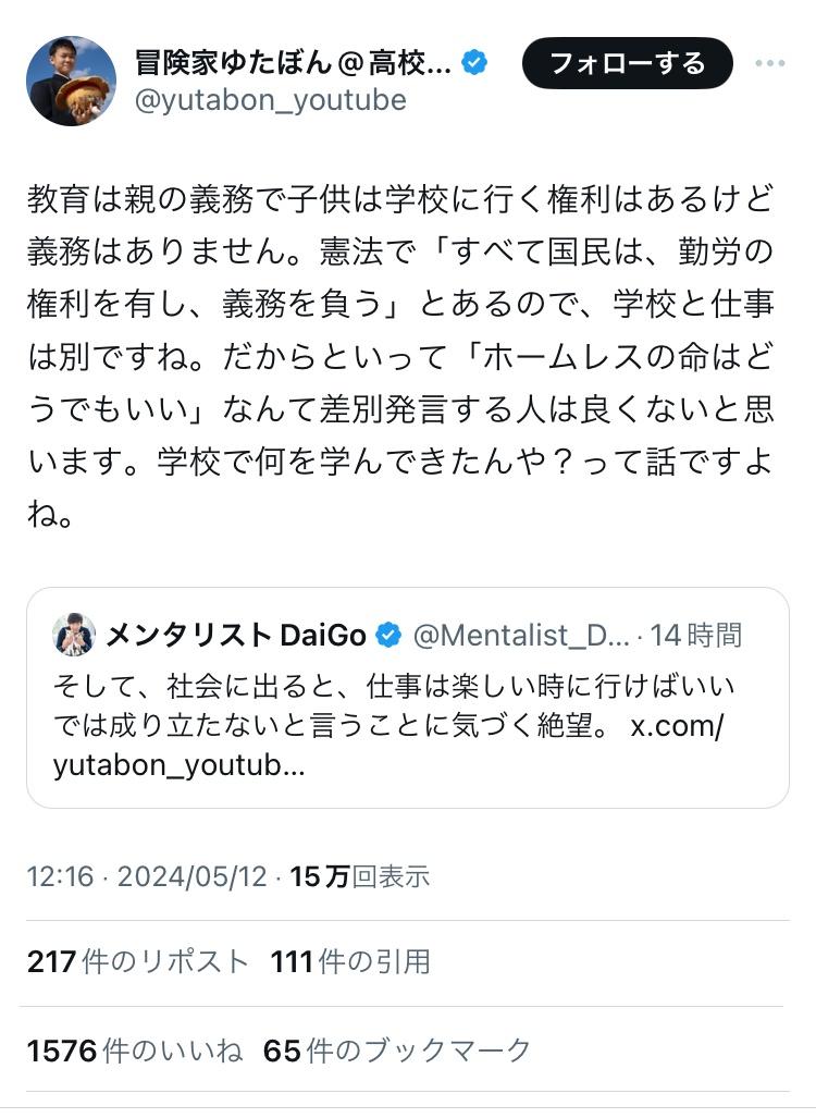 ゆたぼんが論破するたびに学校に行かなくてもいいってことが証明されるの草