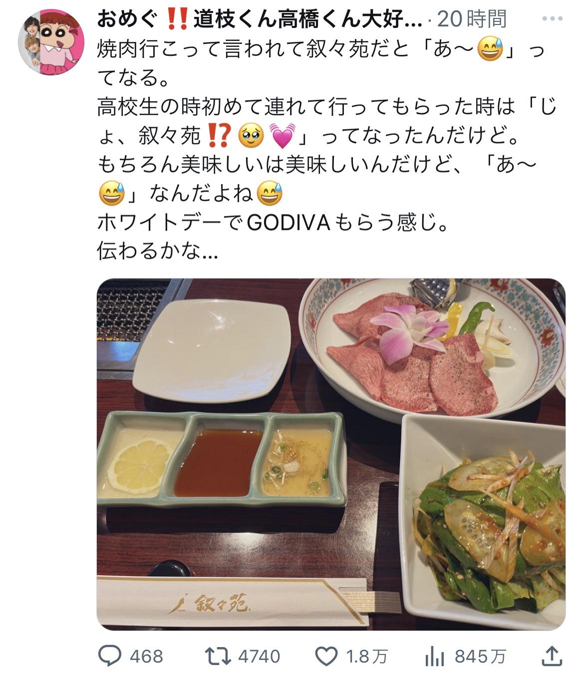 それはそれとしてこいつは若いときから叙々苑行ってました。今更叙々苑ごときで喜びませんが言いたいだけ