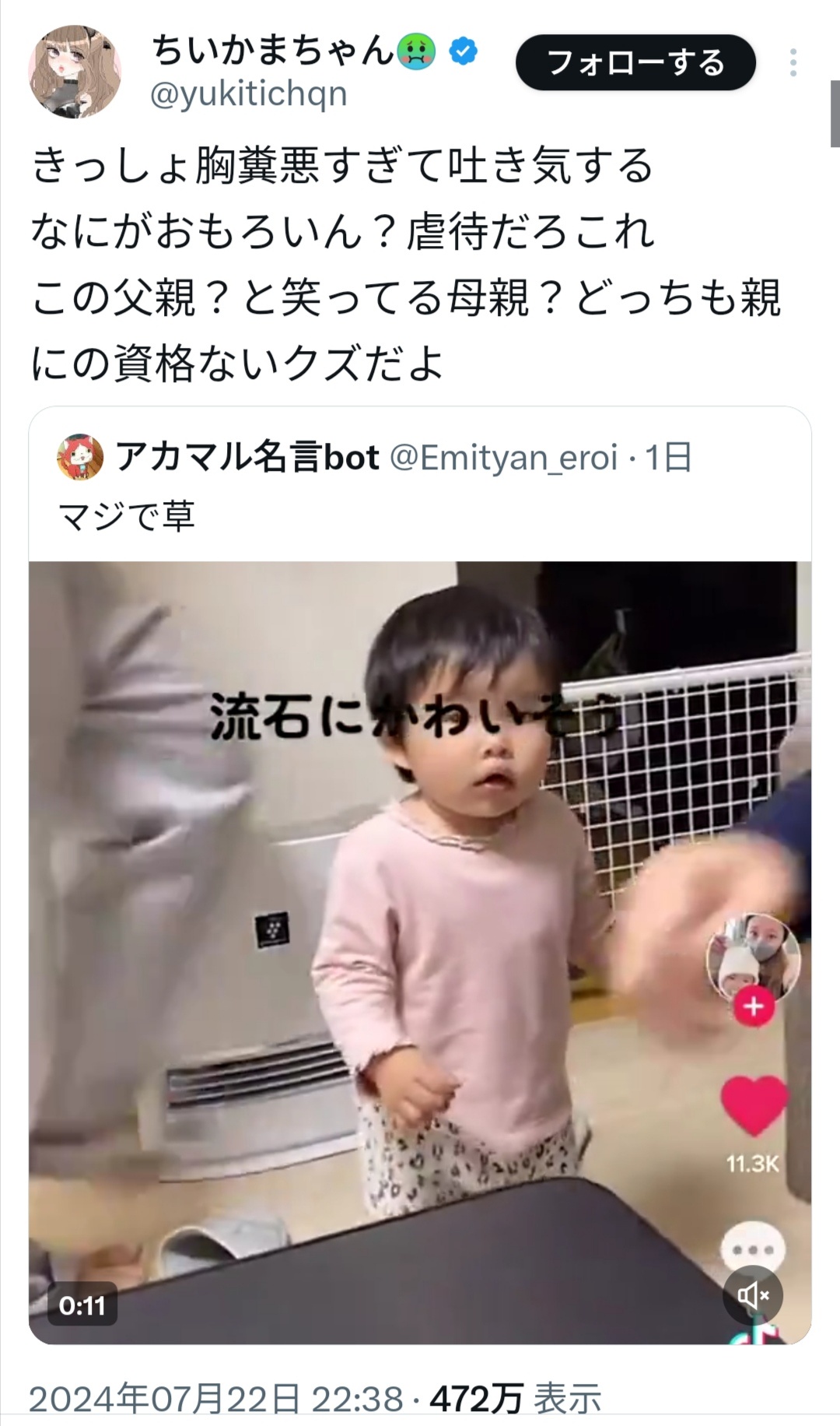 でもこの馬鹿親の元でこの先育ったら歪んでいくんやろなあ・・かわいそう