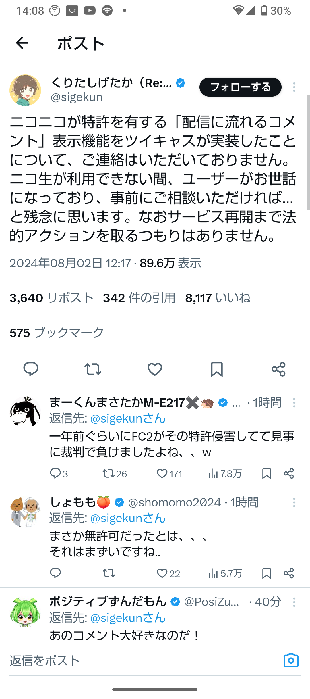 ニコニコが特許を有する「配信に流れるコメント」表示機能をツイキャスが実装したことについて、ご連絡はいただいておりません。ニコ生が利用できない間、ユーザーがお世話になっており、事前にご相談いただければ...と残念に思います。なおサービス再開まで法的アクションを取るつもりはありません。