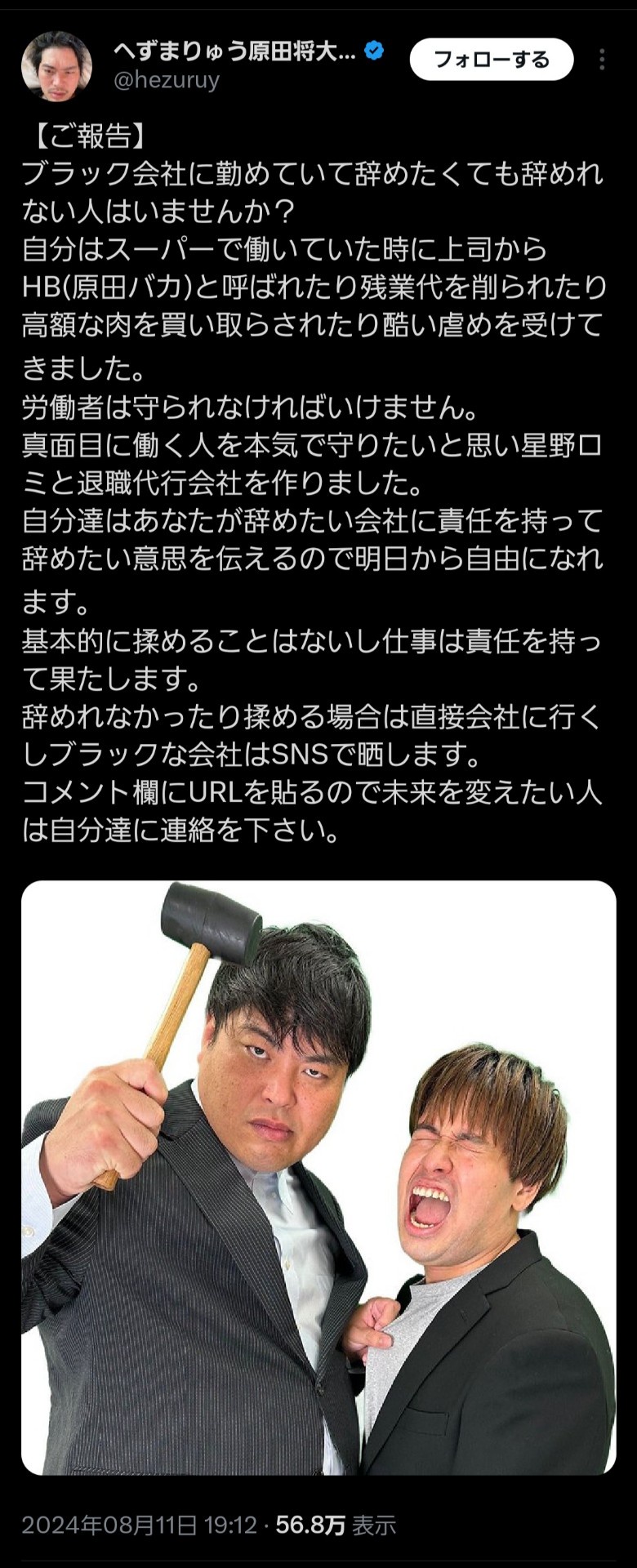 というかそっちが先だろ、注目を集められるネタ (ヤバイやつに突撃) から逆算して退職代行やる事を思いついただけ