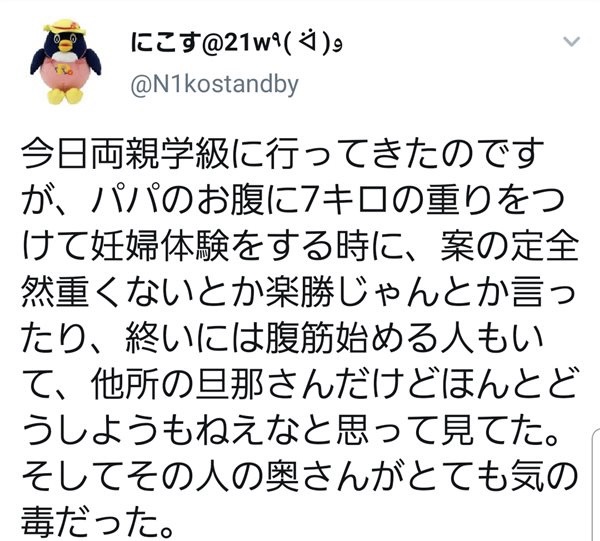 今日両親学級に行ってきたのですが、パパのお腹に7キロの重りをつけて妊婦体験をする時に、案の定全然重くないとか楽勝じゃんとか言ったり、終いには腹筋始める人もいて、他所の旦那さんだけどほんとどうしようもねえなと思って見てた。そしてその人の奥さんがとても気の毒だった。