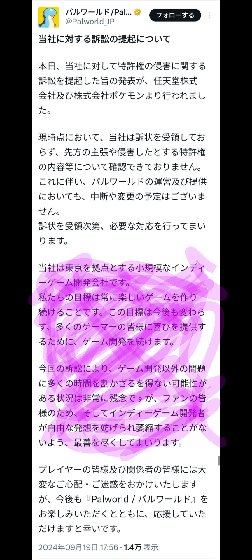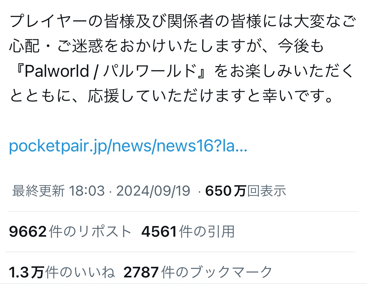 別に任天堂信者ってわけじゃないけど、CEOがSwitchをクソハード呼ばわりしたり、AIを使って「どっちがポケモンか分からない」とかゲーム作りに携わってる人間とは思えない行動や言動ばかり取ってて嫌悪感がハンパなかったからパルワールドはこのまま任天堂に叩き潰されてほしいという気持ちはある。 pic.twitter.com/28rl6WBMSz