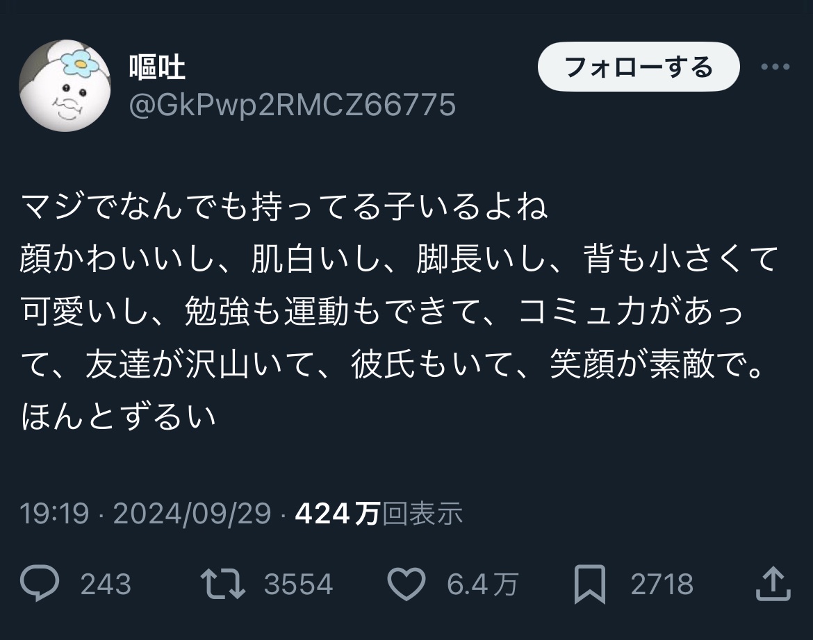 イケメンで、色白で、脚長いし、身長も高くてかっこいいし、勉強も運動もできて、コミュ力があって、友達沢山いて、彼女もいて、ゲームも上手くて