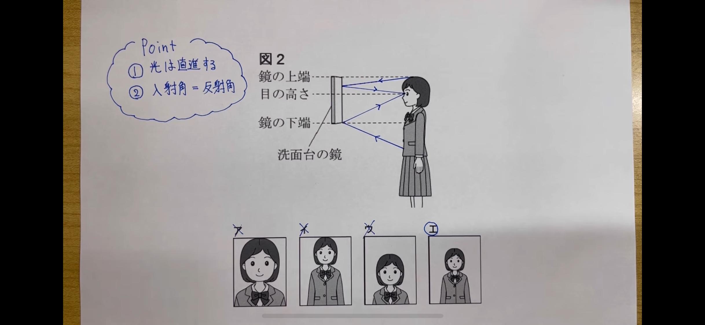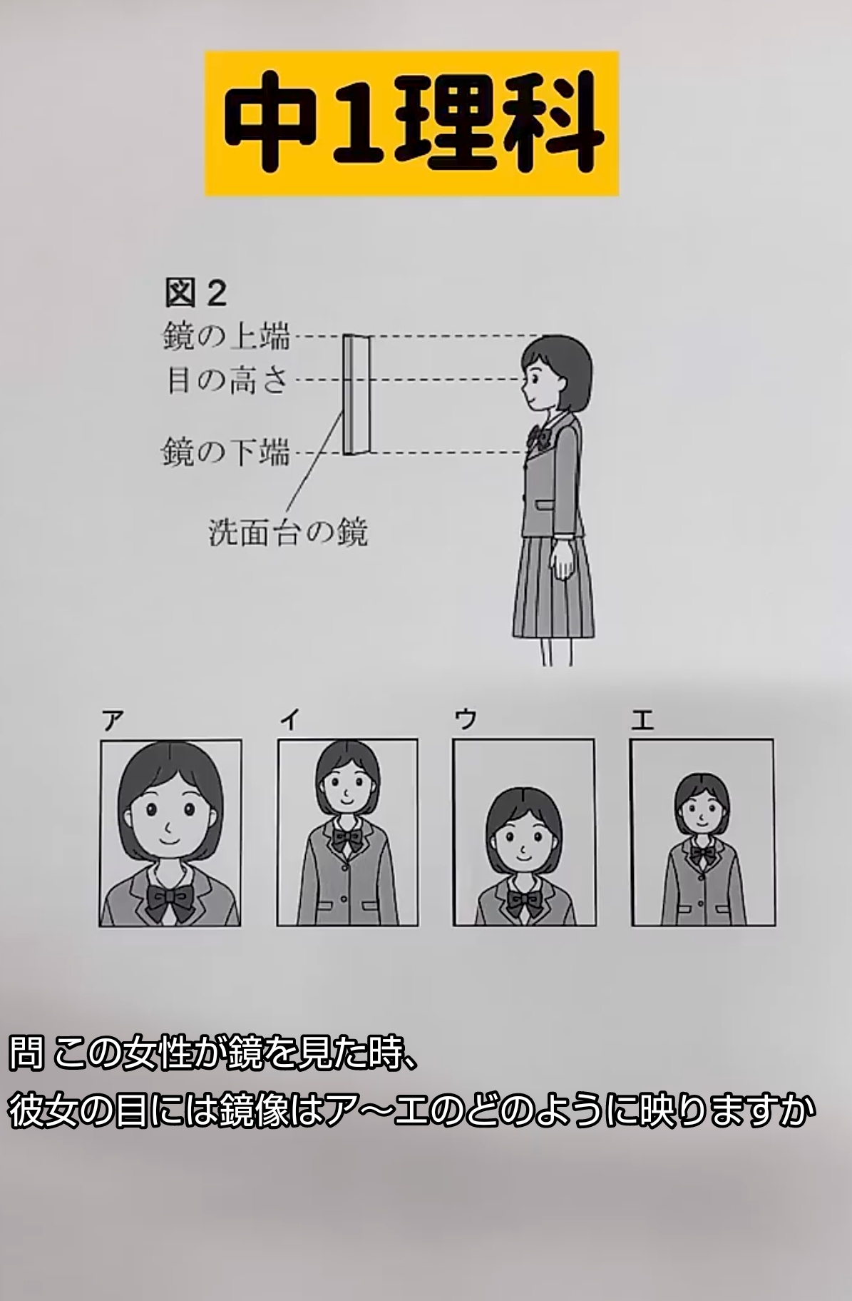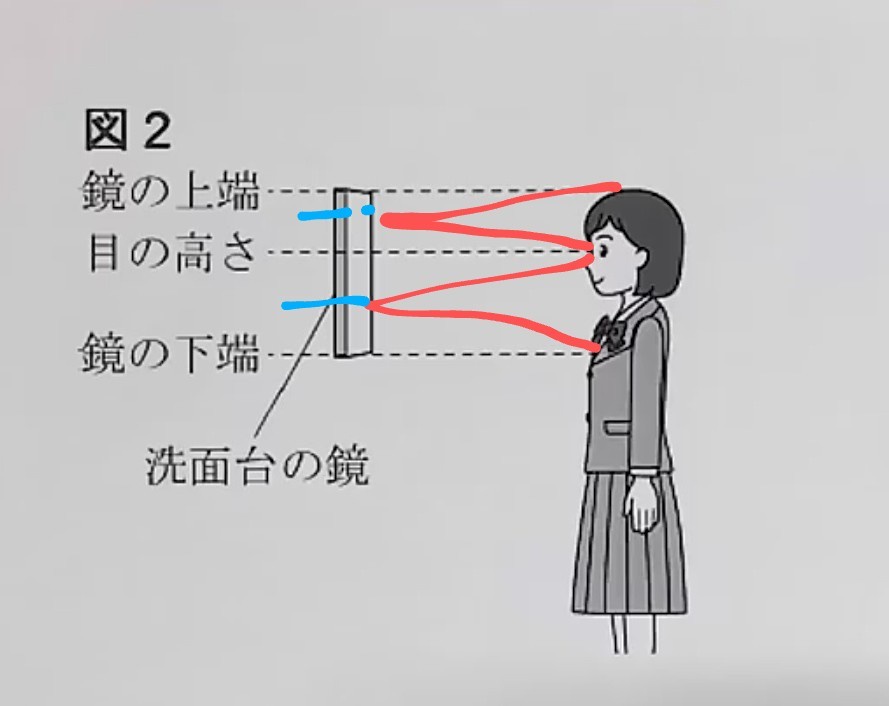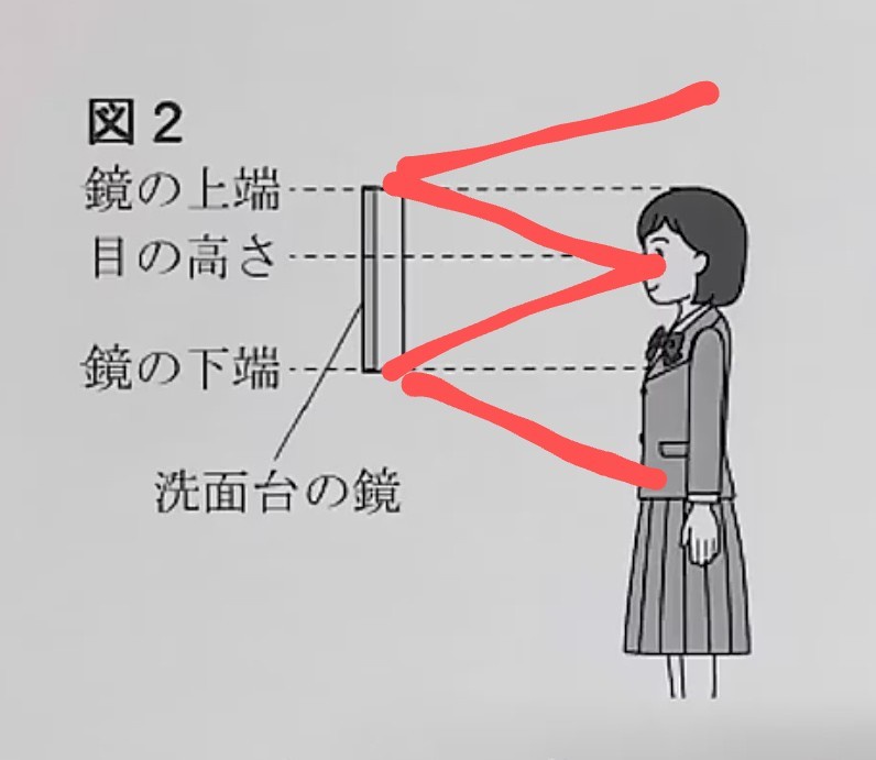 33の説明は頭頂が鏡にうつる位置と、鏡の下端にうつる体の部位を示していてチグハグなので美しくない。