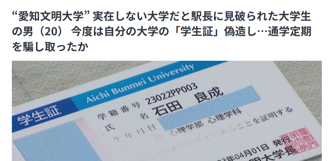 “愛知文明大学” 実在しない大学だと駅長に見破られた大学生の男(20) 今度は自分の大学の「学生証」偽造し…通学定期を騙し取ったか