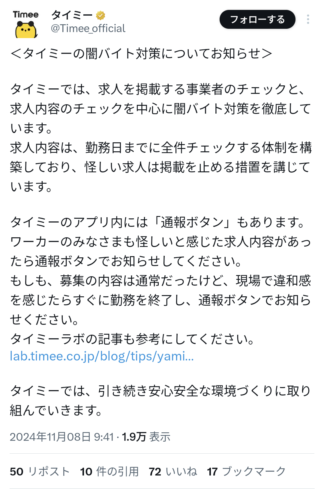 <タイミーの闇バイト対策についてお知らせ>