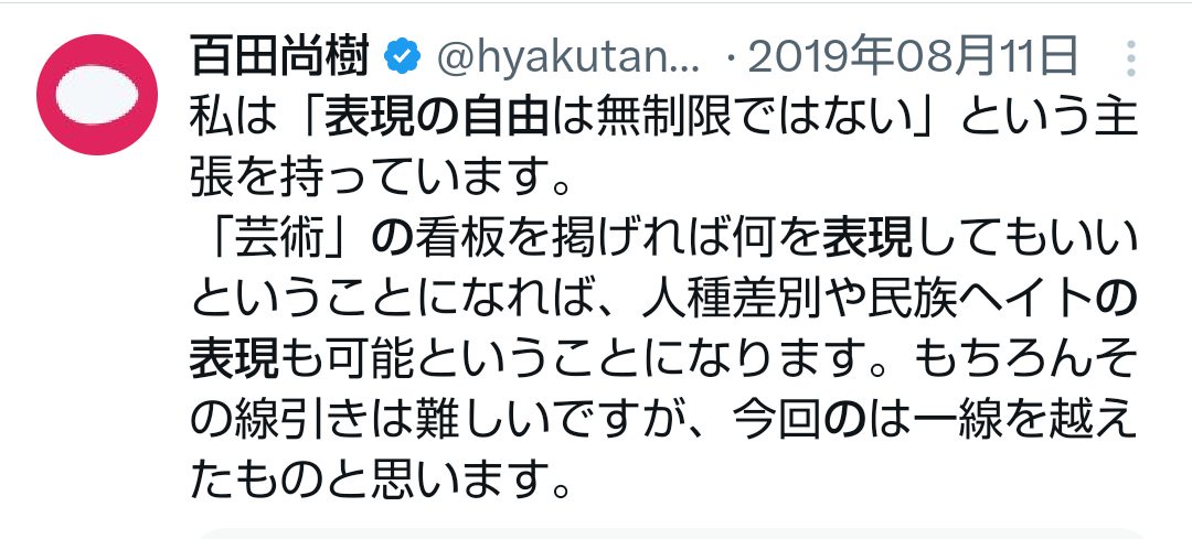 私は「表現の自由は無制限ではない」という主張を持っています。 「芸術」の看板を掲げれば何を表現してもいいということになれば、人種差別や民族ヘイトの表現も可能ということになります。