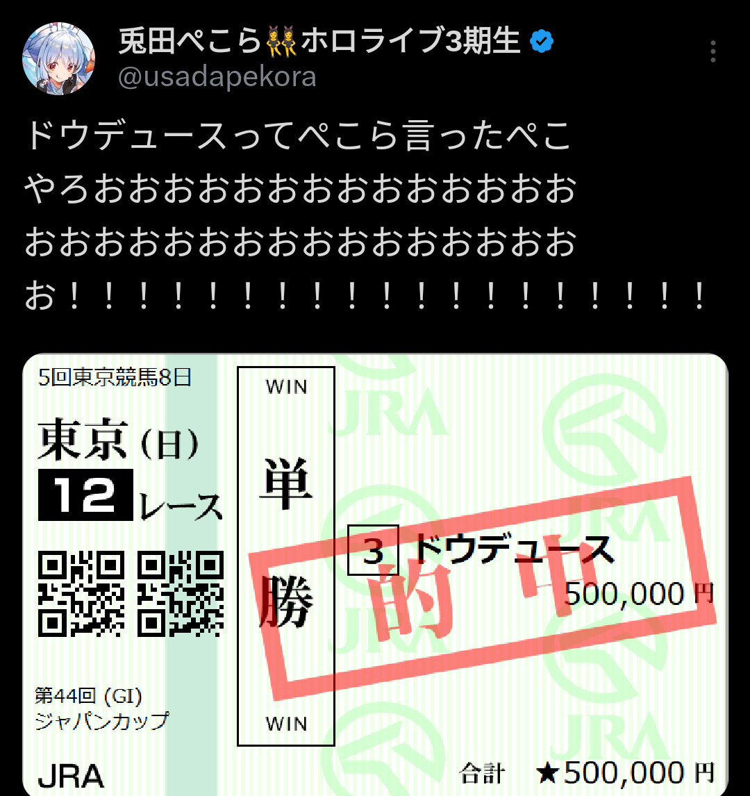 ドウデュースってぺこら言ったぺこやろおおおおおおおおおおおおおおおおおおおおおおおおおおおおおおお!!!!!!!!!!!!!!!!!!! pic.twitter.com/KyrG6FO5pM