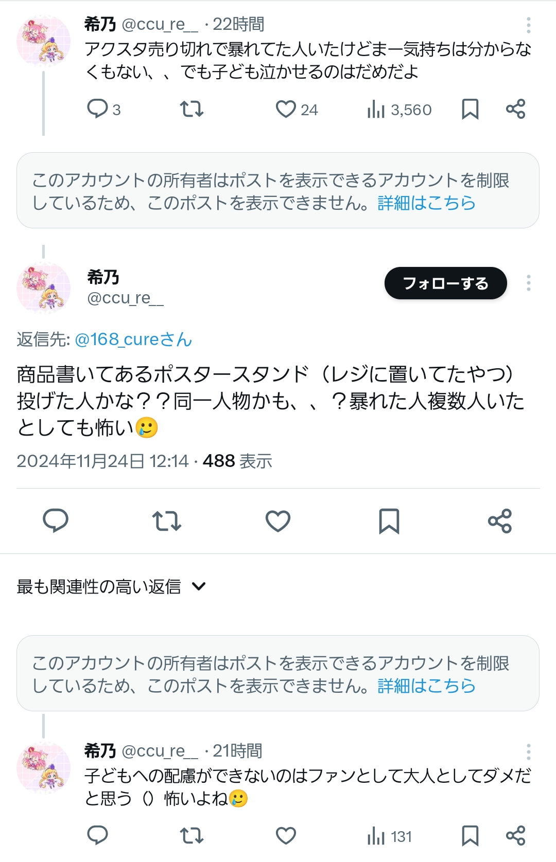 ガチのプリキュアオタクか女児目的の変態か傍から見てもわからないから子供連れてると不安なんだわ