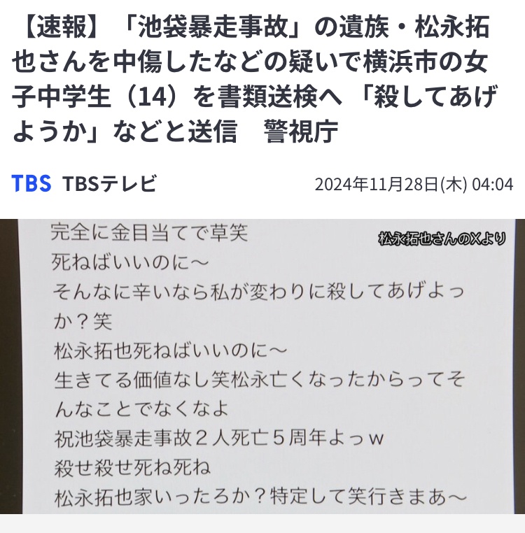 今年9月、「池袋暴走事故」の遺族・松永拓也さんをメールで中傷したなどとして、警視庁が横浜市の女子中学生を書類送検する方針を固めたことがわかりました。