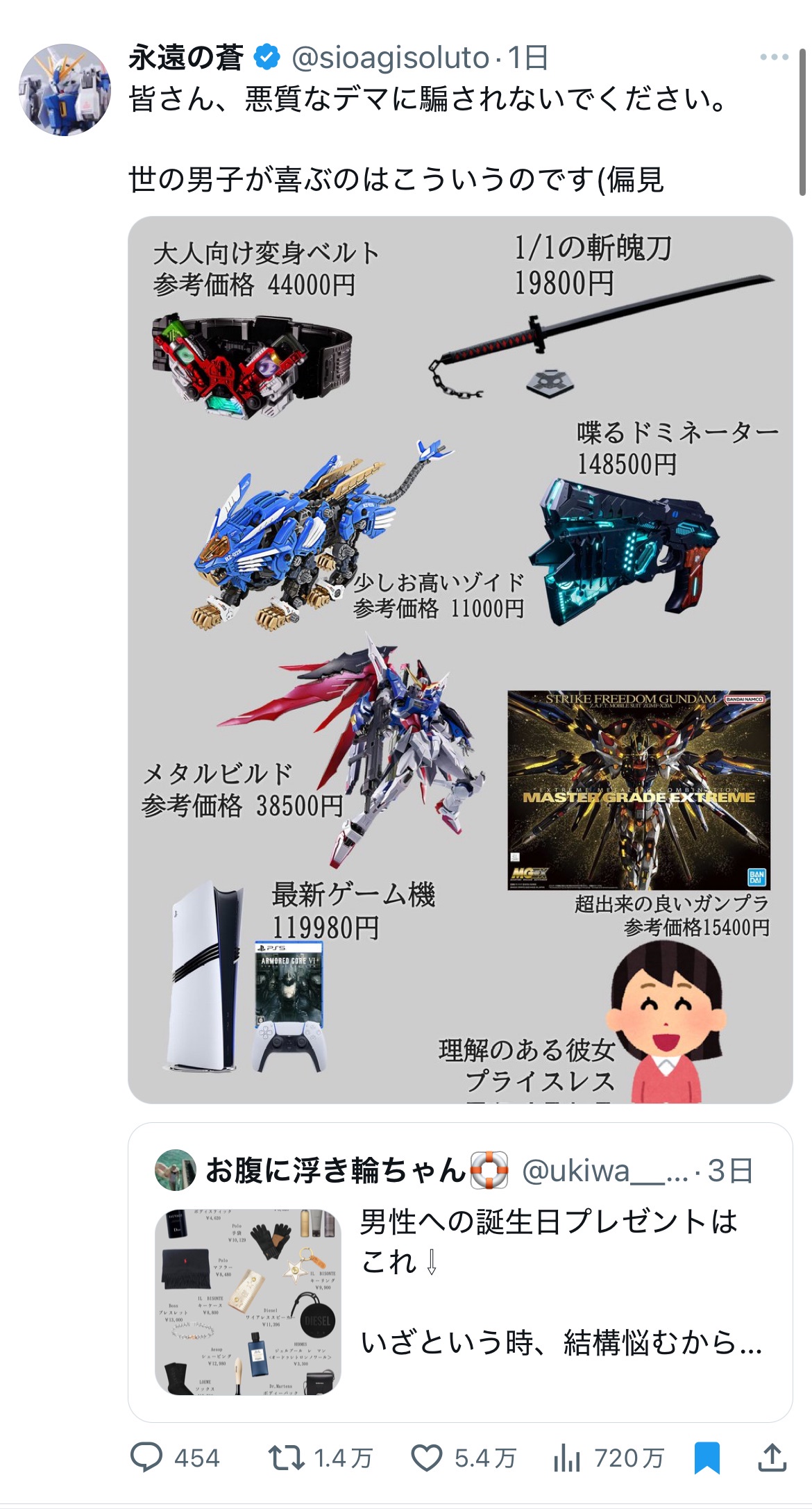 オモチャがいらないのは確かだけど、ブランドアイテムが欲しいかというとそれも違うんだよ、それは女が身につけて欲しいってだけだろ