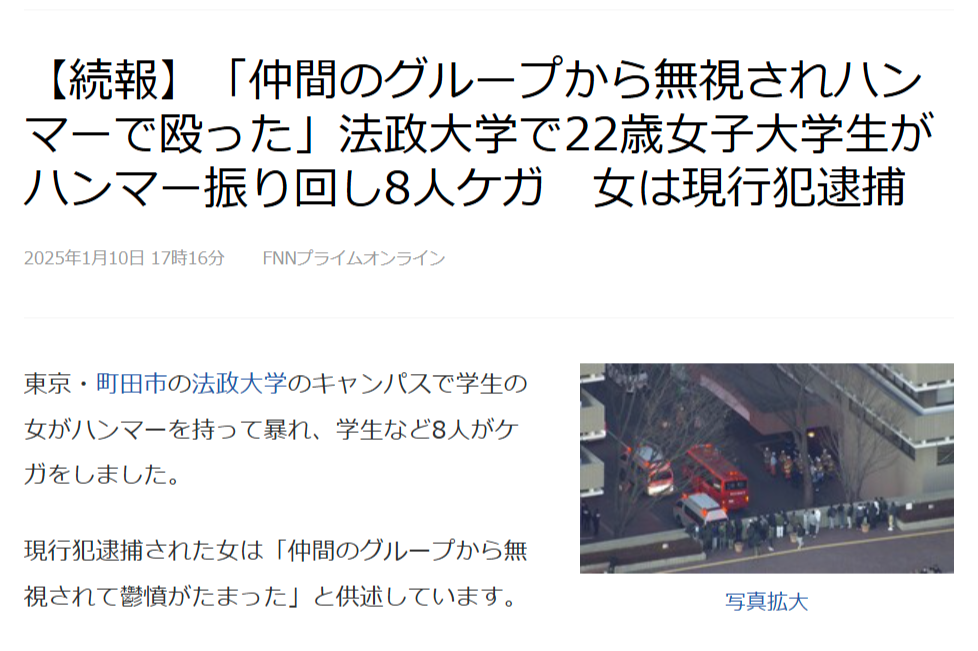 【続報】「仲間のグループから無視されハンマーで殴った」法政大学で22歳女子大学生がハンマー振り回し8人ケガ 女は現行犯逮捕
