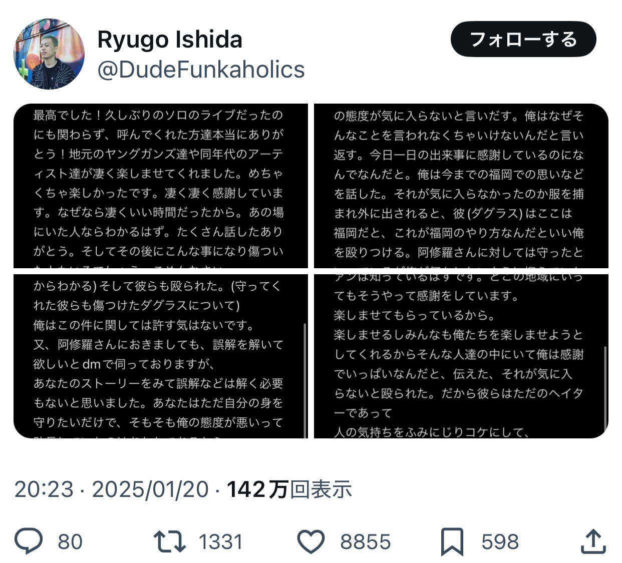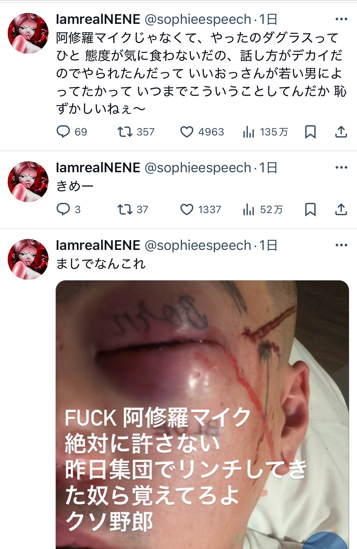 画像の人が難癖つけられて殴られたけど、相手側はそっちから喧嘩売ってきたと言ってるが現場を見てない第三者が画像の人が自分から喧嘩売るなんてあり得ないと言ってるって感じ?