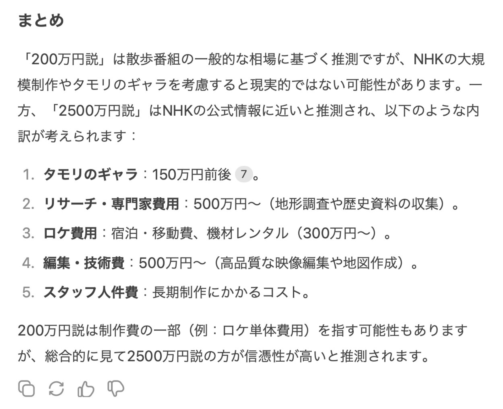 「ブラタモリ という番組の制作費が1本200万円という噂です。内訳を考えてください」