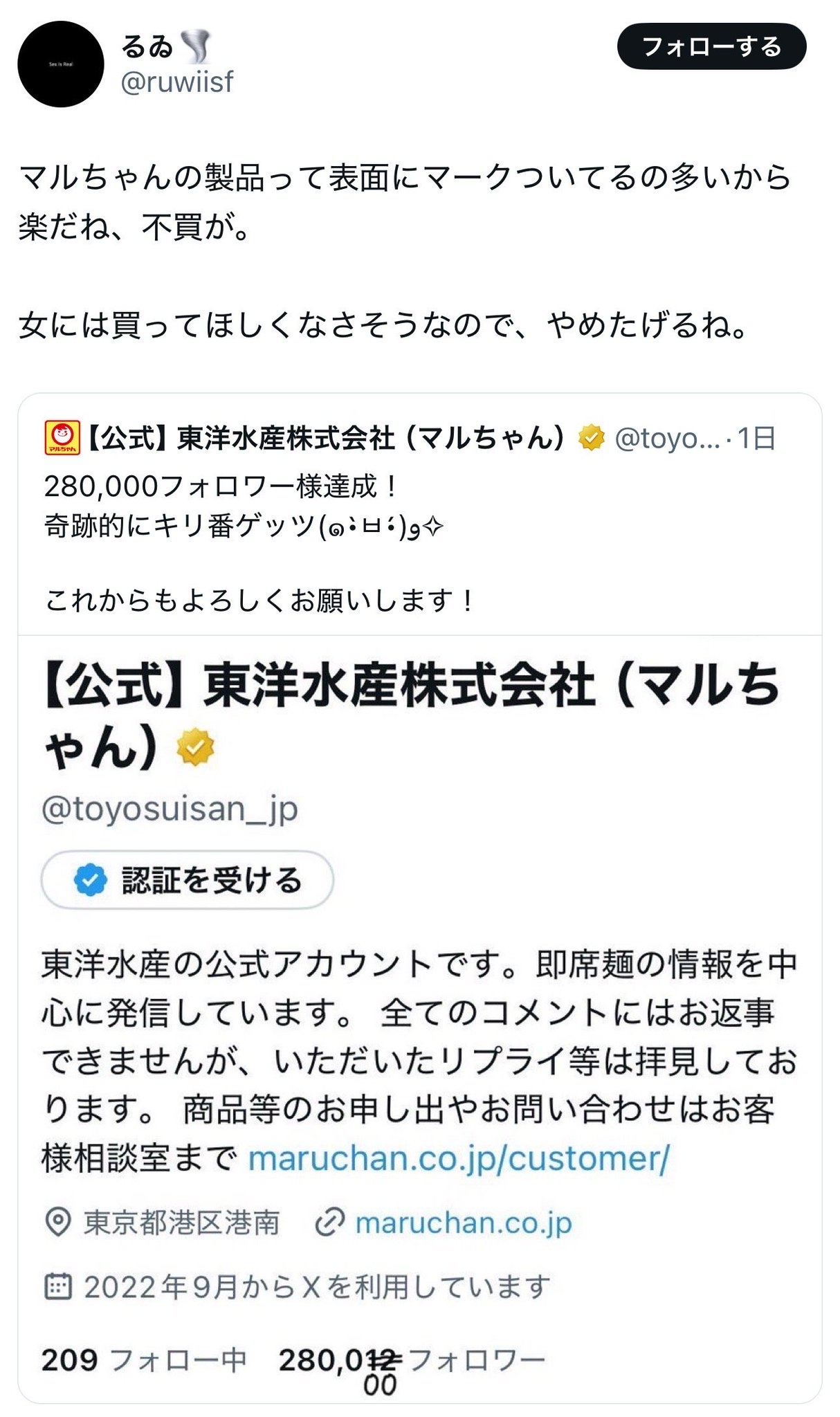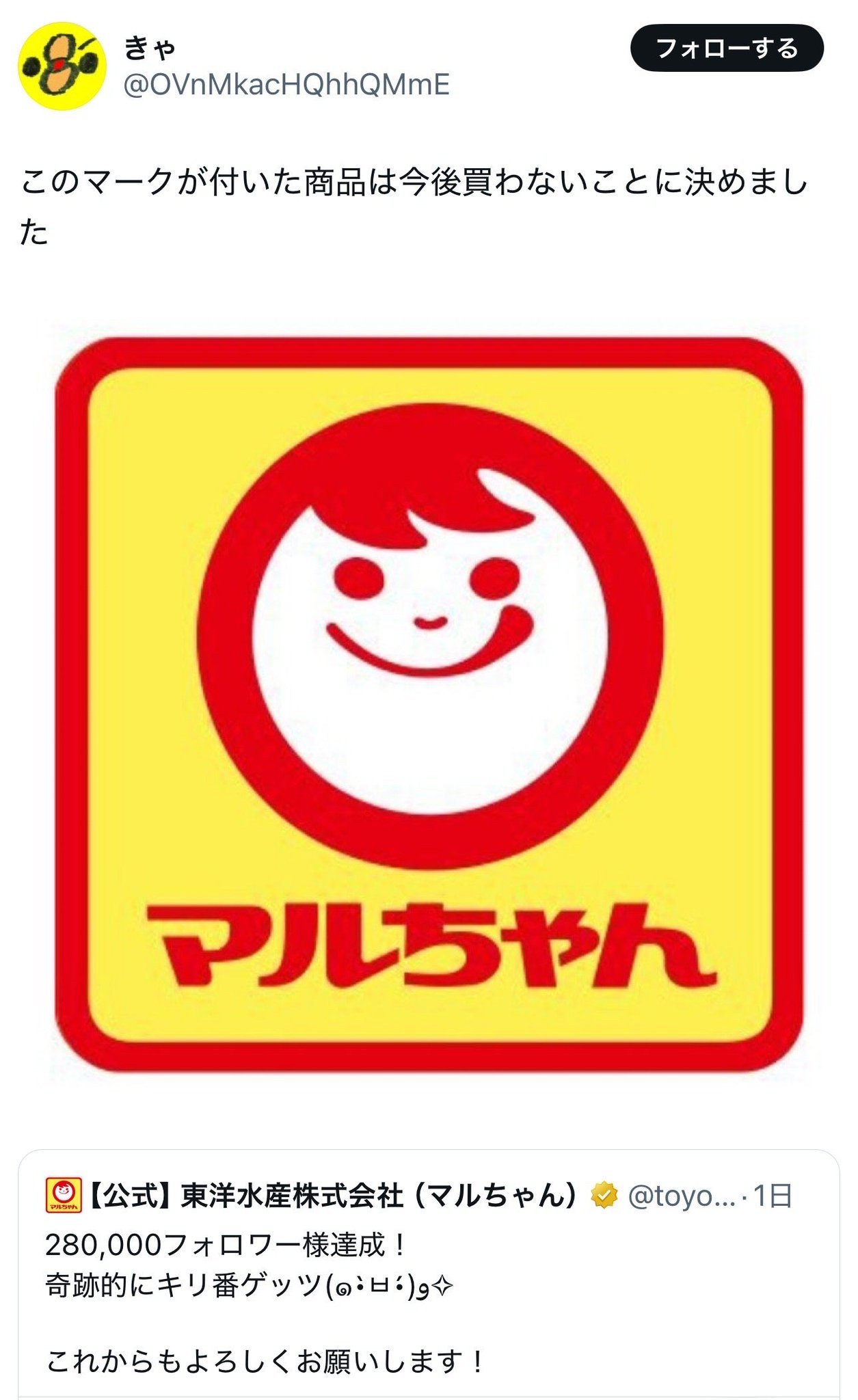 マルちゃんの購買層って元々フェミさん達は大した割合じゃないだろうしダメージないでしょ