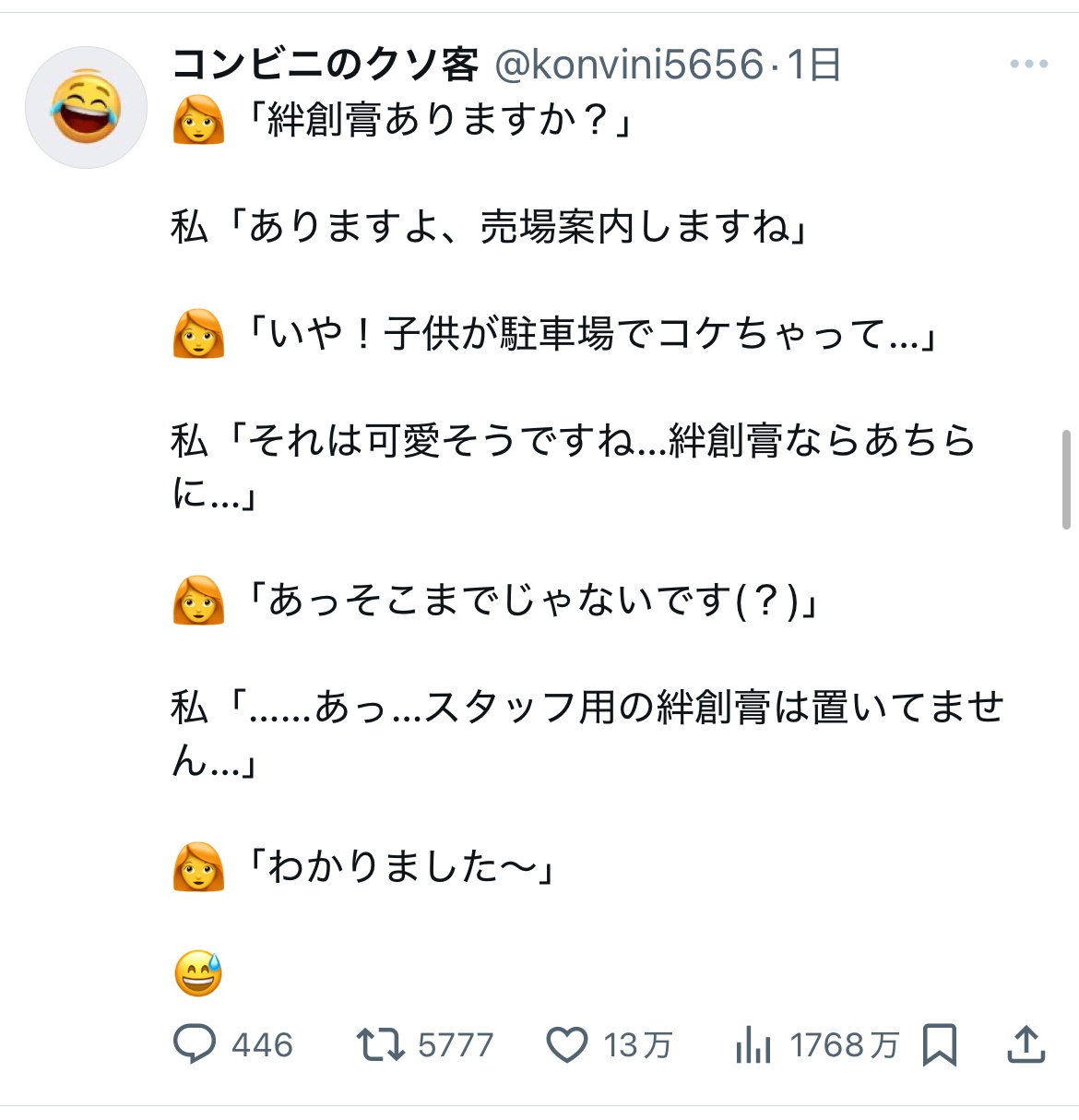 そもそも絆創膏を商品として扱ってないのにくれみたいに言ってくる