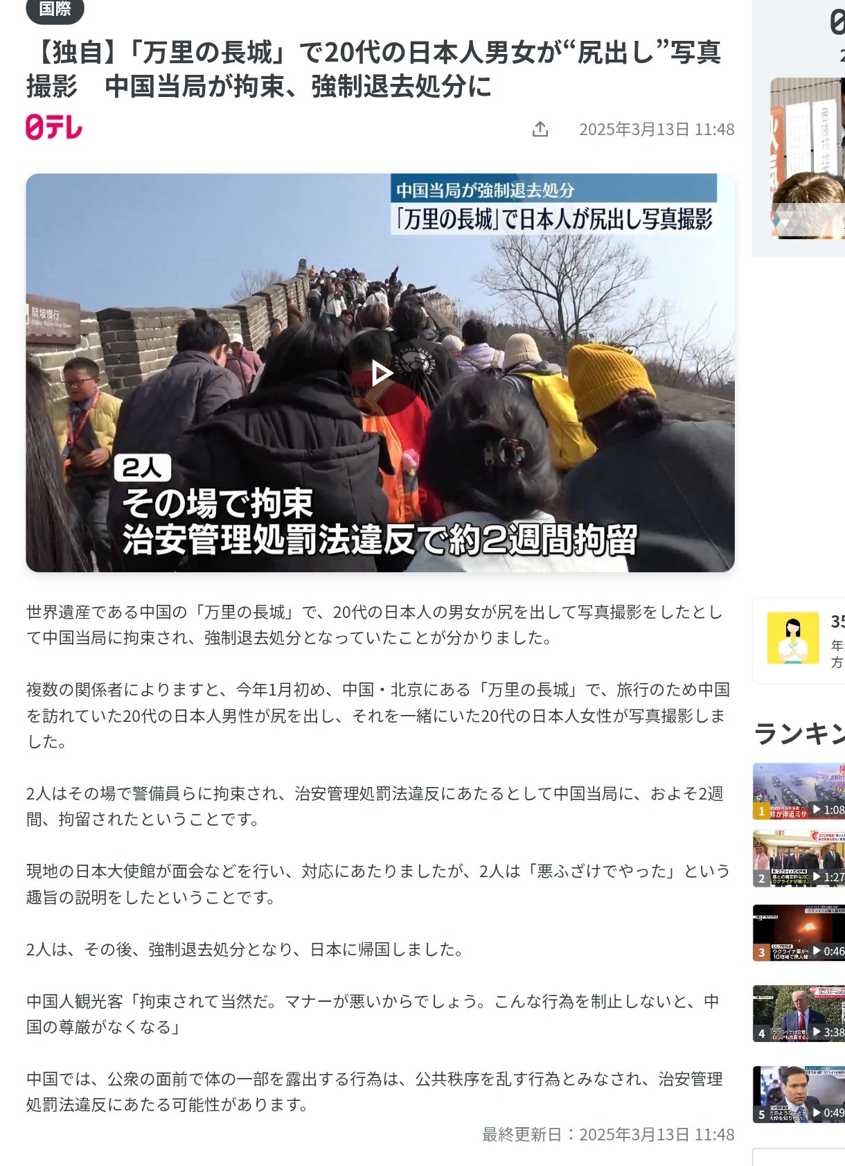 世界遺産である中国の「万里の長城」で、20代の日本人の男女が尻を出して写真撮影をしたとして中国当局に拘束され、強制退去処分となっていたことが分かりました。